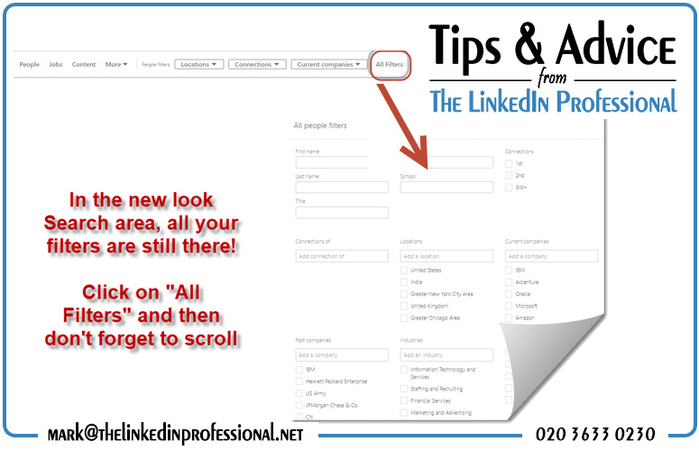 To reach them, you need to be on the “People” search area – so click in the search box at the top of the page and choose “People” from the drop down menu that appears. Then click on the “All filters” button on the right hand side and ‘Hey Presto!’ the wonderful world of LinkedIn search is revealed to you.