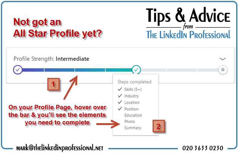 On your own Profile page, if you are not already “All Star”, you should see a bar indicating some complete your profile is according to their criteria – hover over it and a pop up box will indicate which items are missing to get you to the next level.