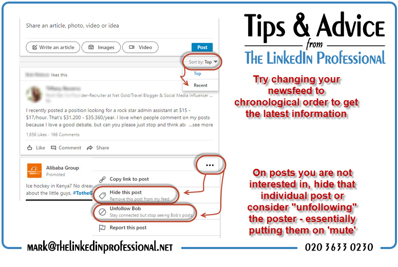 LinkedIn has been going to greater and greater lengths to modify and customise what we see in this news feed to make it as relevant as possible – with varying degrees of success IMHO. However, you also have control over what you see there as well, either by changing the order so that you see “New” at the top (ie. chronological order) as well as weeding out posts or connections which are not quite what you are looking for.