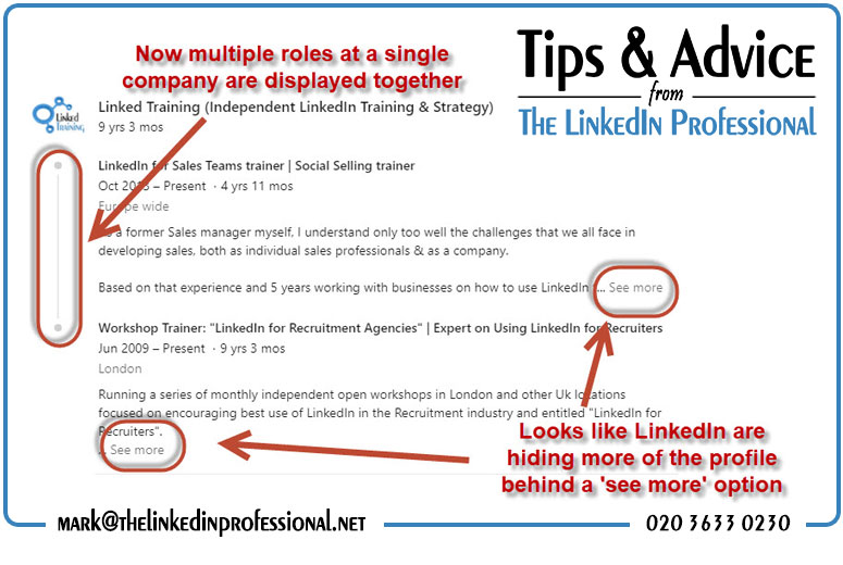 Firstly, LinkedIn has just introduced a ‘See more’ option on my profile meaning that vast chunks of my Work Experience section are now “below the line” and only accessible after a click.