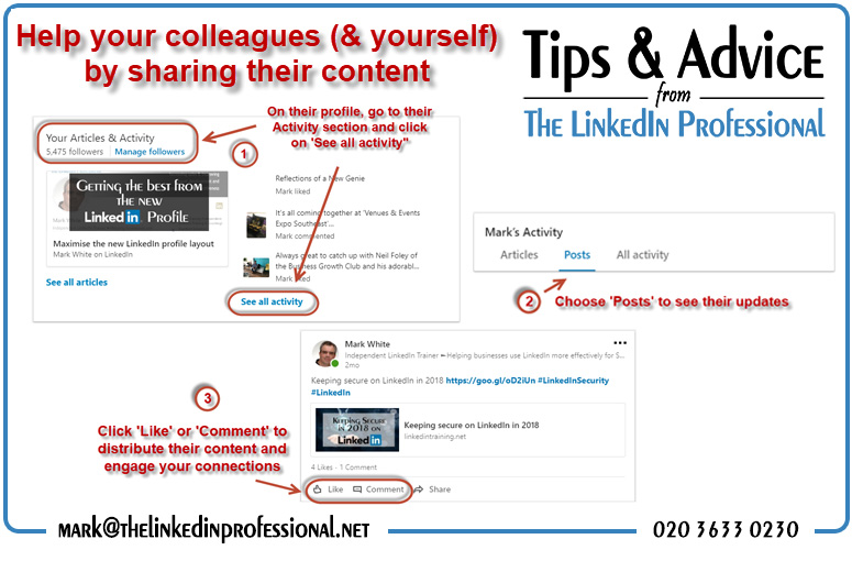Then help yourself and your colleagues (or your network) by passing on valuable information that they have posted to your own connections simply by clicking ‘like’ or leaving a ‘comment’ on one of their updates.